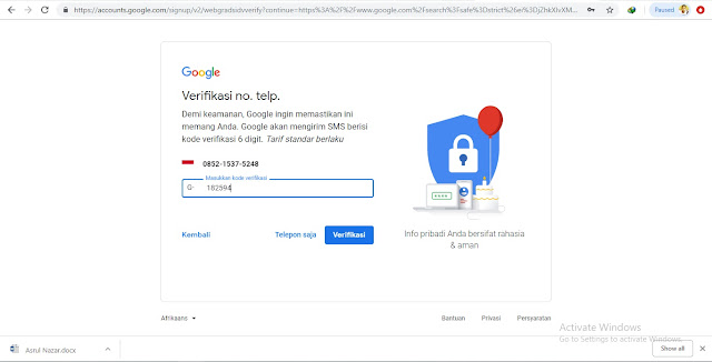 Kalian akan menerima SMS kode komfirmasi ke nomor Hp yang kalian masukan tadi, silahkan kalian masukan nomor komfirmasi yang dikirimkan google ke HP kalian atau Hp ibu/bapak kalian. selanjutnya klik tulisan "Verifikasi". setelah kalian mengklik tulisan verifikasi maka akan muncul gambar seperti di bawah ini